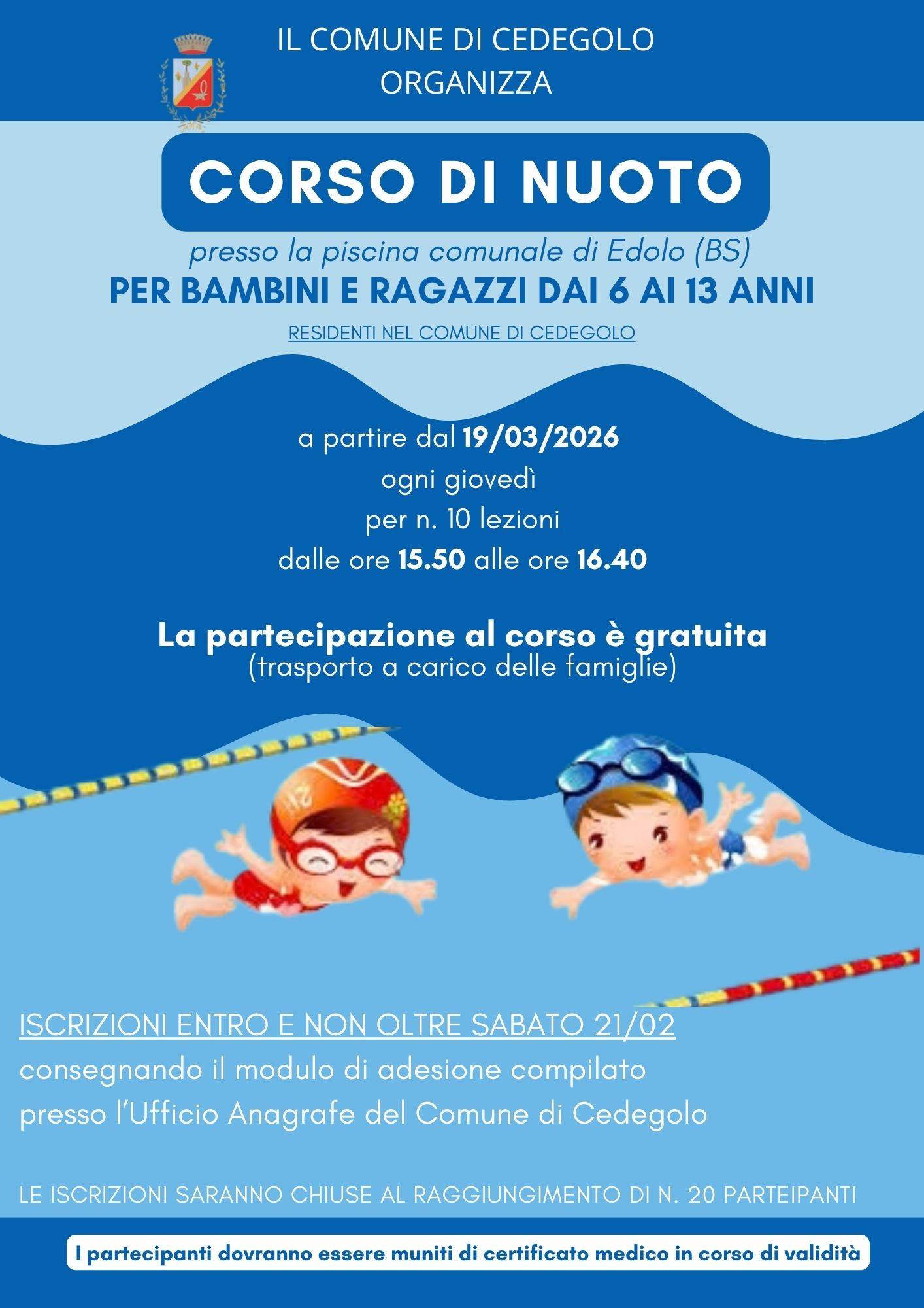 Il Comune di Cedegolo organizza un corso di nuoto, riservato ai residenti dai 6 ai 13 anni, presso la Piscina di Edolo nel pomeriggio di giovedì dalle ore 15.50 alle ore 16.40 nelle seguenti date: