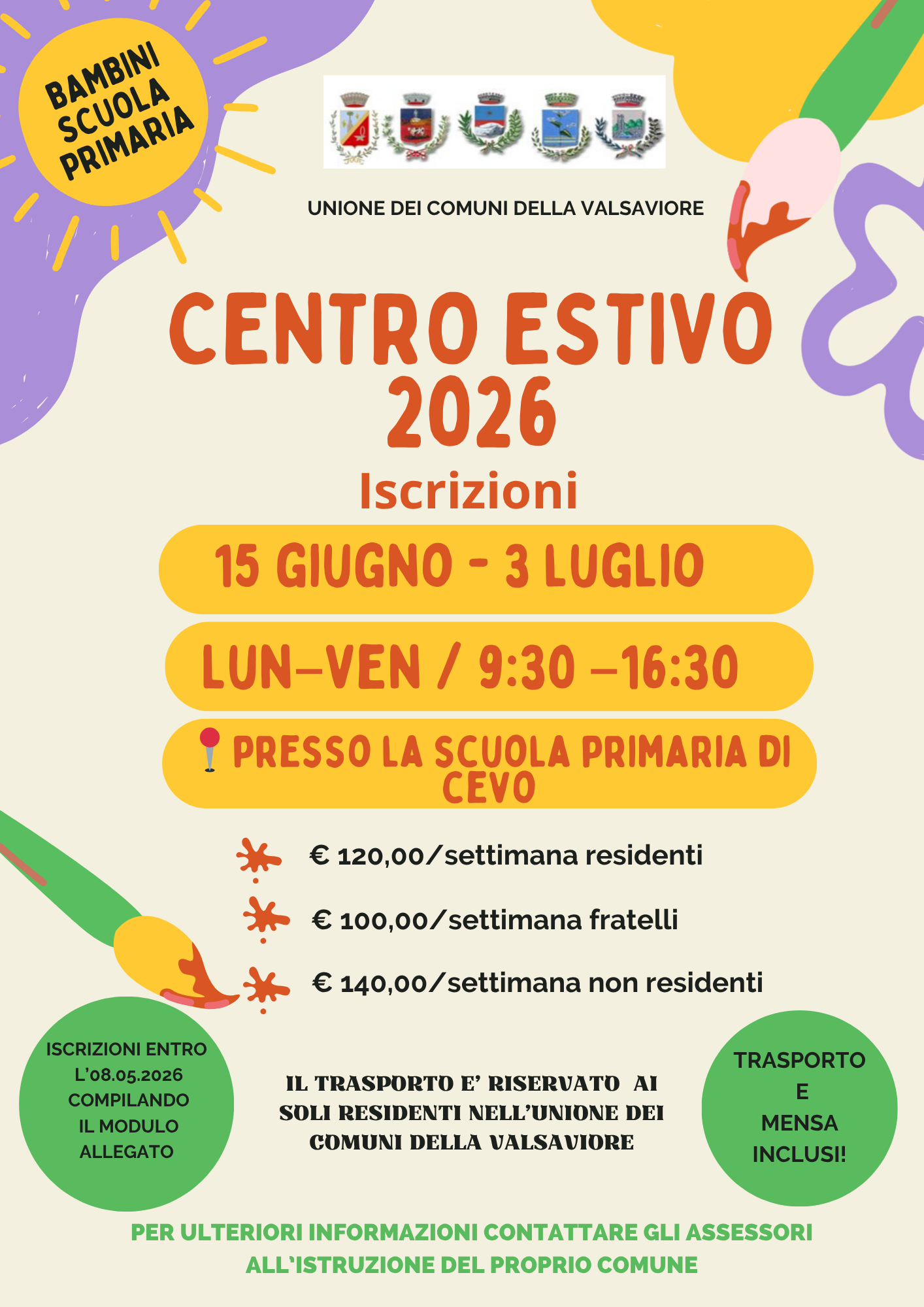 L'Unione dei Comuni della Valsaviore ha aperto le iscrizioni per il Centro Estivo riservato agli alunni della scuola primaria, presso la Scuola Primaria di Cevo per il periodo 15 giugno - 3 luglio, dal lunedì a venerdì dalle ore 9.30 alle ore 16.30.